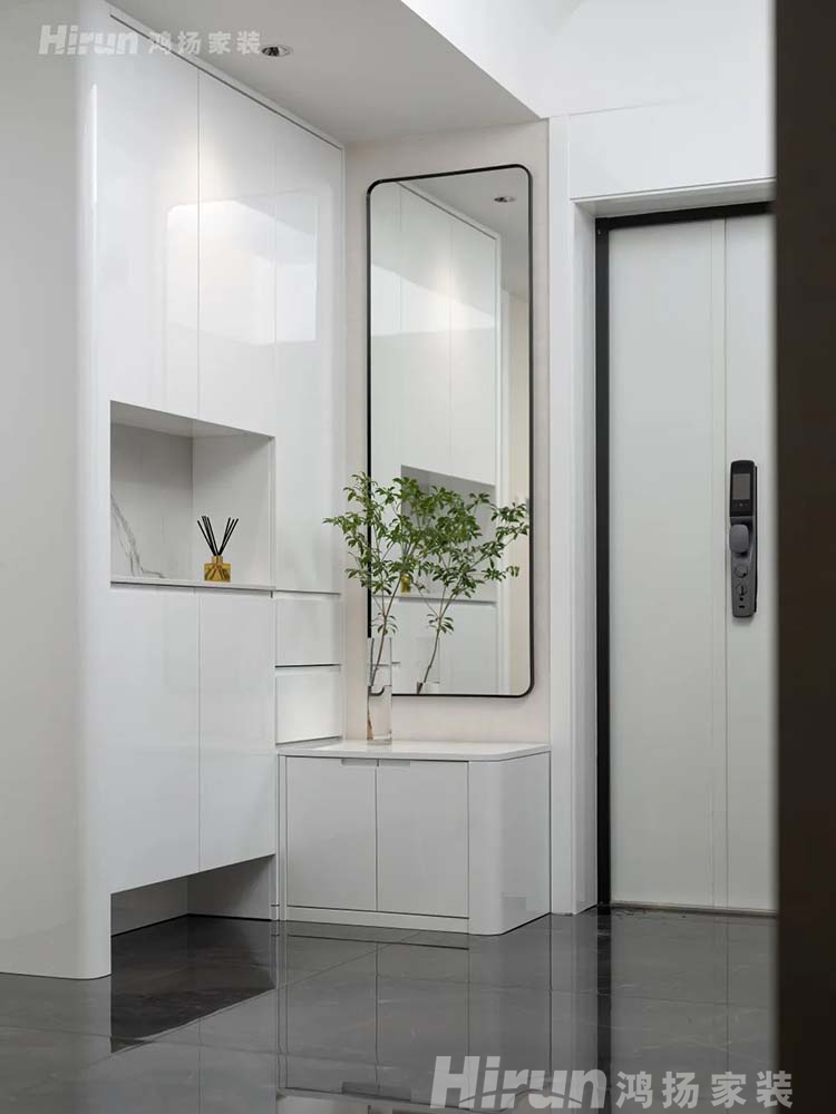 一門到頂的定制鞋柜,白色的漆面與墻面相融,整個鞋柜在空間中毫不突兀,完美貼合設計。