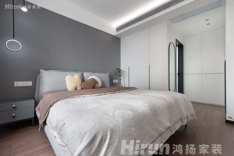 量身定制的窄邊收口白色衣柜透露著細節所帶來的精致感,整個臥室通過不同層次的顏色和材質的肌理營造一股靜謐氛圍。