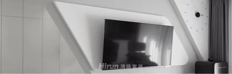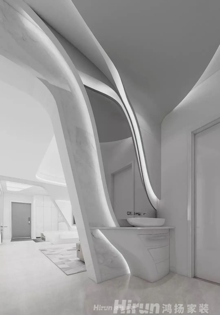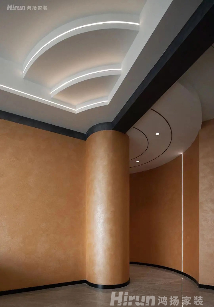 如果設計了弧形吊頂,那么設計弧形的墻體與其能產生互相呼應,相得益彰的效用,空間中將更具弧形帶來的藝術感;而墻體作為空間的一部分,可以將弧形這種流動元素注入整個居住空間中,加強區域與區域之間的聯系與交互性,更輕松地放大空間視覺效果。