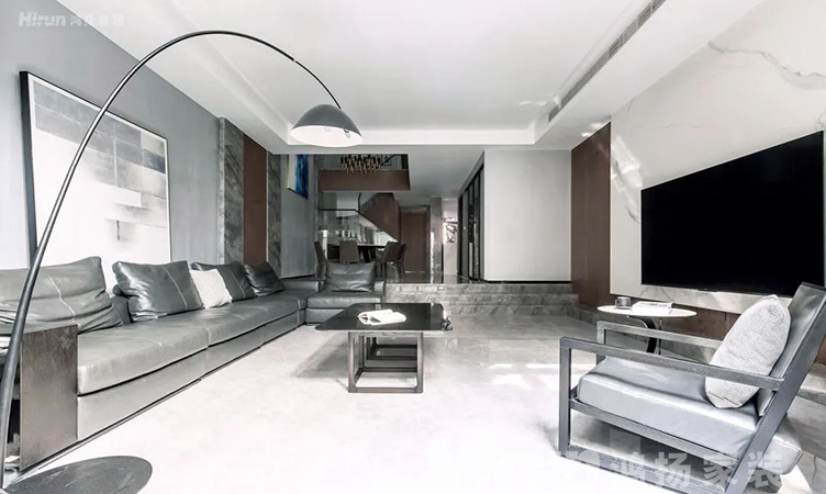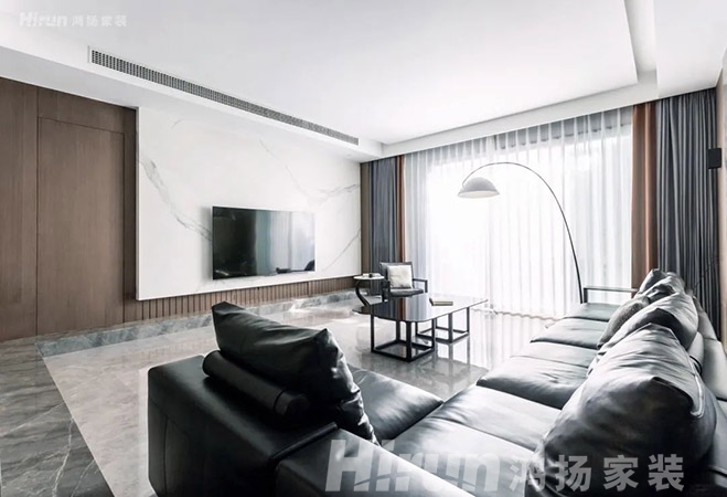電視背景墻處,大理石紋的巖板搭配木制格柵,各自的肌理碰撞出不同的火花,利用木制的溫潤給灰色空間帶來溫馨與舒適。