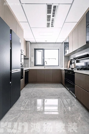 廚房緊鄰餐廳,雙開門大冰箱內嵌節省空間,圍合式的操作臺大大增加了使用面積,哪怕幾個人同時下廚也不會感覺到擁擠,蒸箱烤箱、洗碗機、凈水器、抽油煙機一應俱全,讓烹飪更加便利。