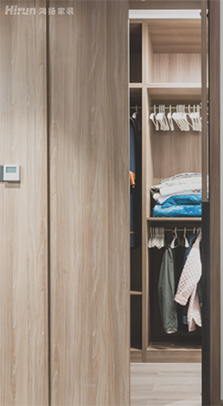 主臥衣帽間設置成無柜門的更衣室型收納空間,男女主人分區分季節以掛為主的形式收納衣物,并在衣帽間設有帶鎖抽屜和保險柜。